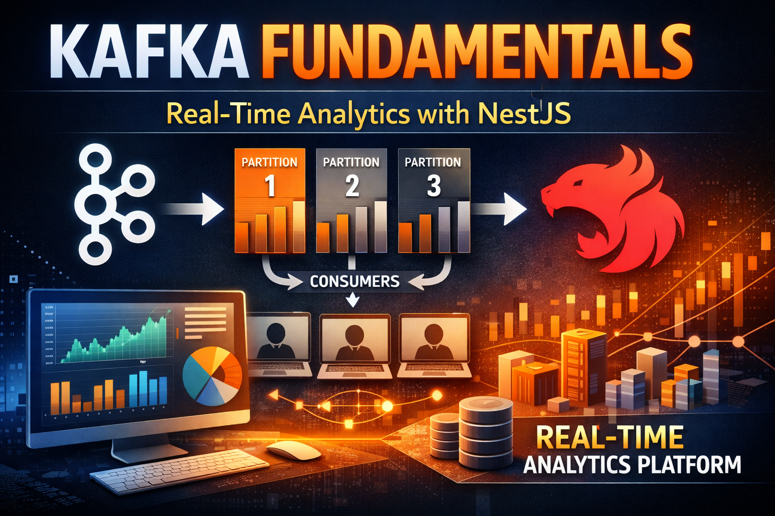 Master Kafka from core concepts to production. Learn topics, partitions, consumer groups, exactly-once semantics, and build a complete real-time analytics platform with NestJS.