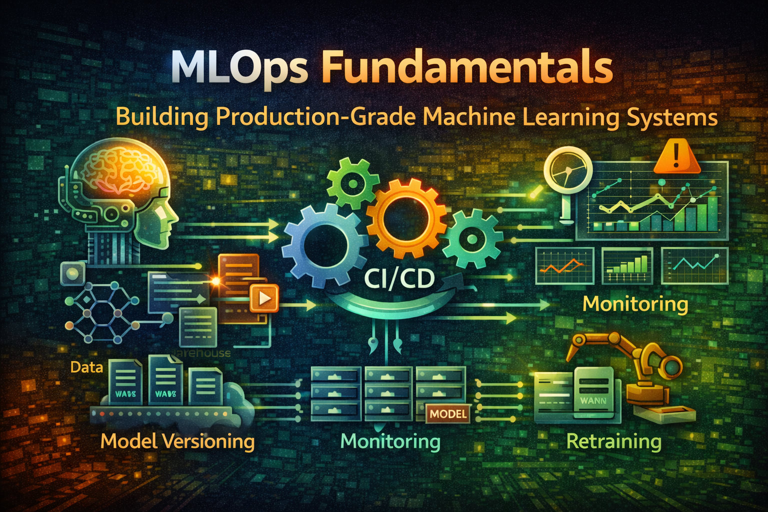 Master MLOps essentials for deploying, monitoring, and maintaining machine learning models in production. Learn model versioning, CI/CD pipelines, monitoring, and retraining strategies.