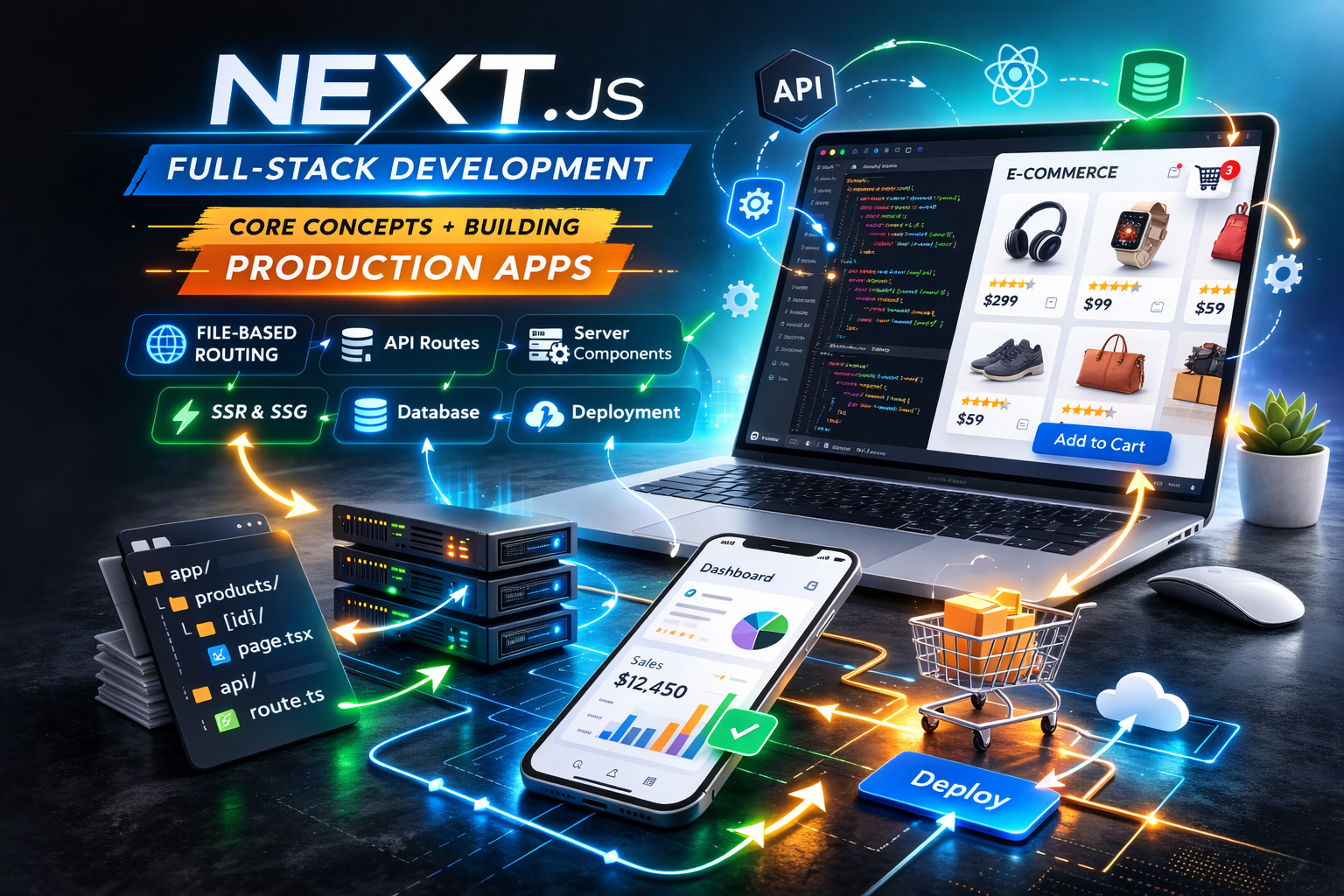 The e-commerce platform we built demonstrates all core Next.js concepts in action. Understanding file-based routing, server components, API routes, data fetching strategies, and deployment is essential for building modern Next.js applications.