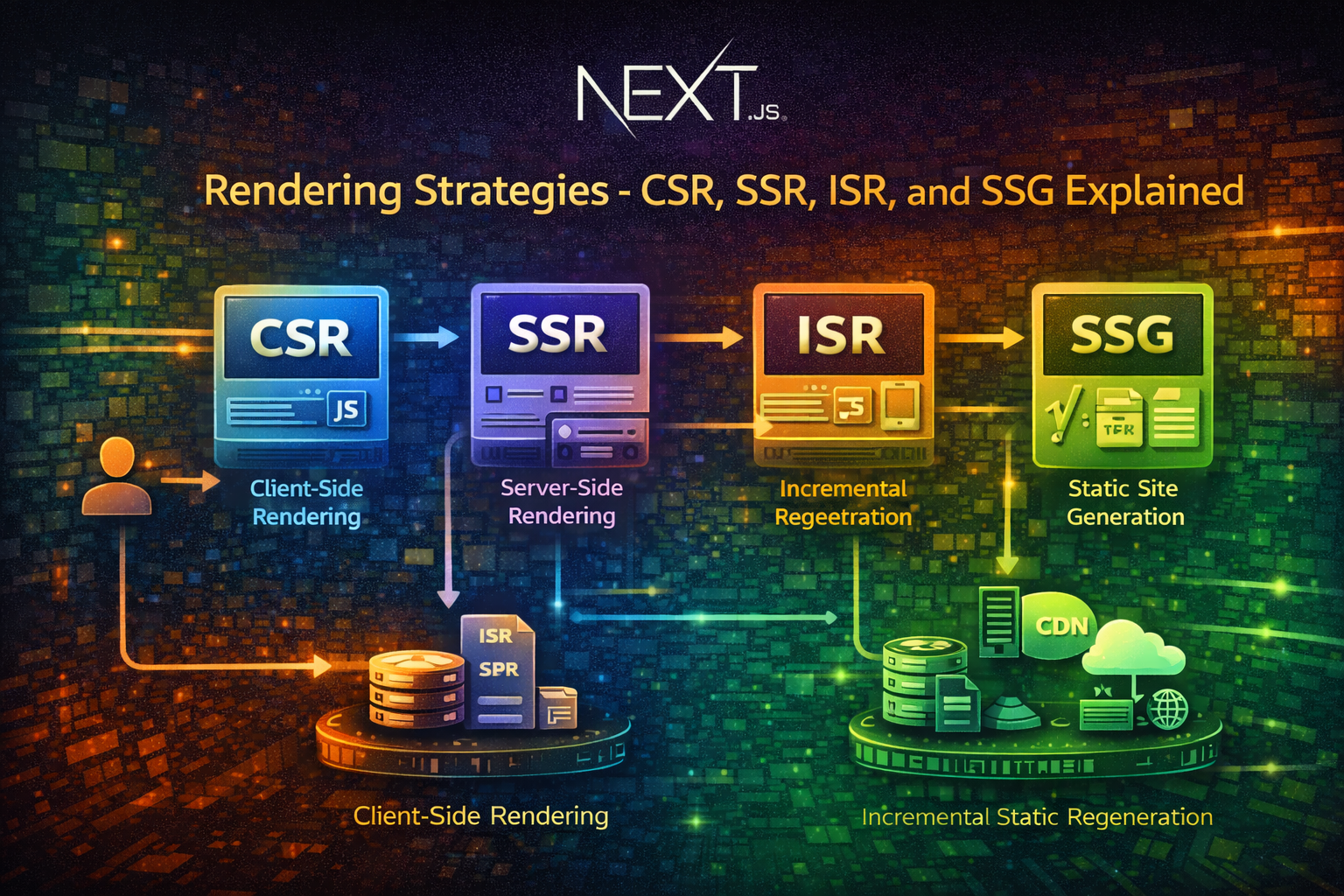 Master Next.js rendering strategies. Learn how CSR, SSR, ISR, and SSG work under the hood, when to use each approach, and how to implement them for optimal performance and SEO.