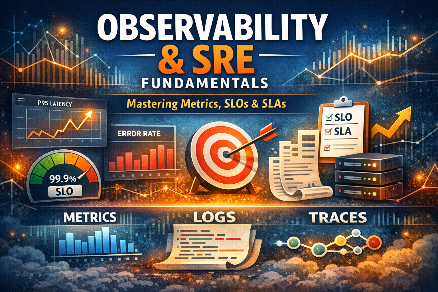 Master the foundations of observability and SRE practices. Learn the three pillars of observability, understand metrics types like counters and histograms, decode SLIs, SLOs, and SLAs, and discover why percentiles matter more than averages in production systems.
