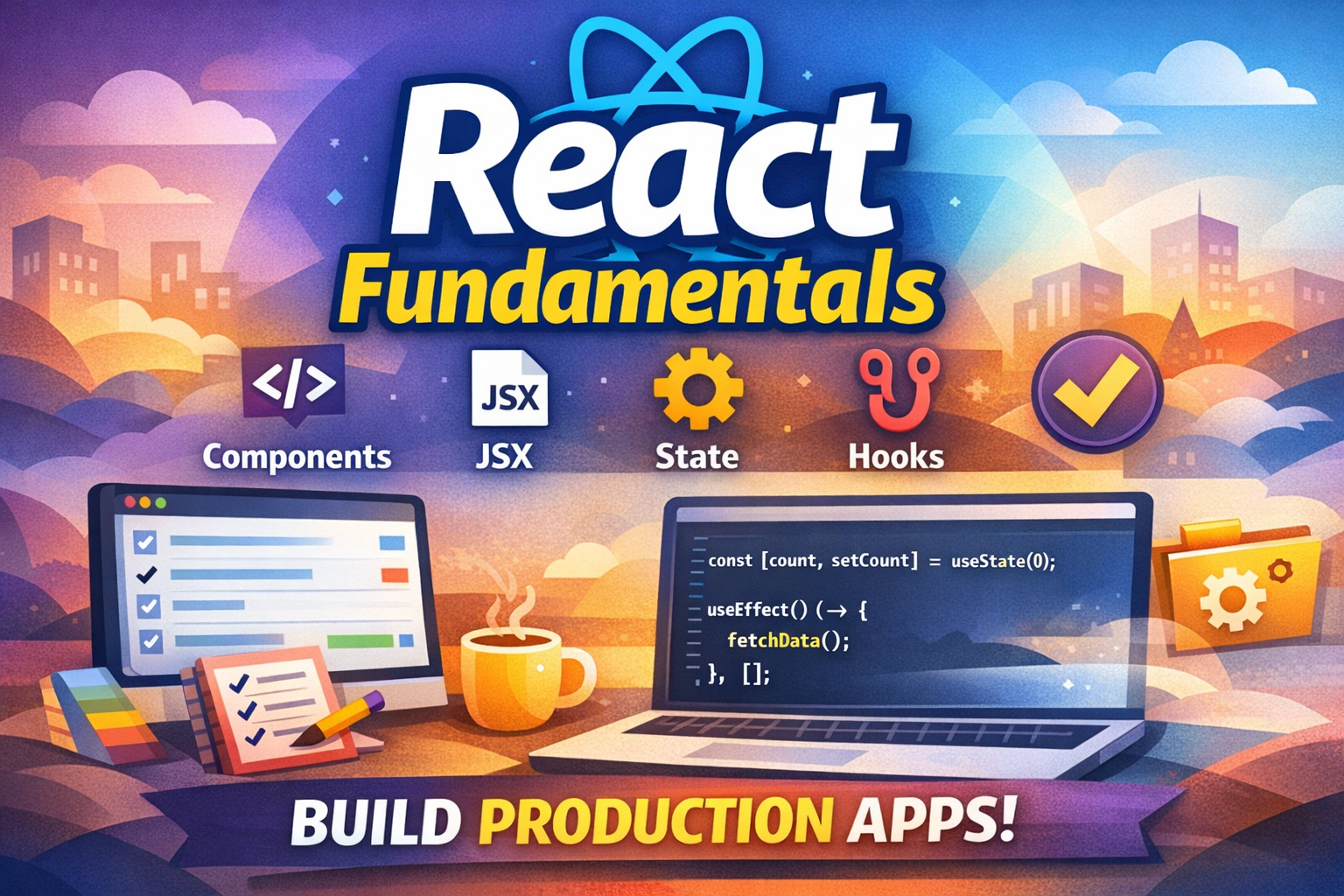 Master React from the ground up. Learn why React was created, understand core concepts like components, JSX, state, props, hooks, and lifecycle. Build a complete production-ready task management app covering all React fundamentals with best practices.