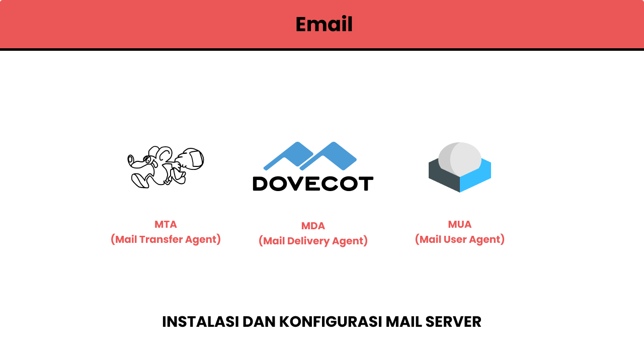 Postfix adalah sebuah service untuk Mail Transfer Agent (MTA) untuk me-routing atau mengarahkan dan mengirim surat elektronik (email), Postfix menggunakan protocol SMTP (Simple Mail Transfer Protocol). Dovecot meruapakan sebuah service untuk Mail Delivery Agent (MDA), Dovecot