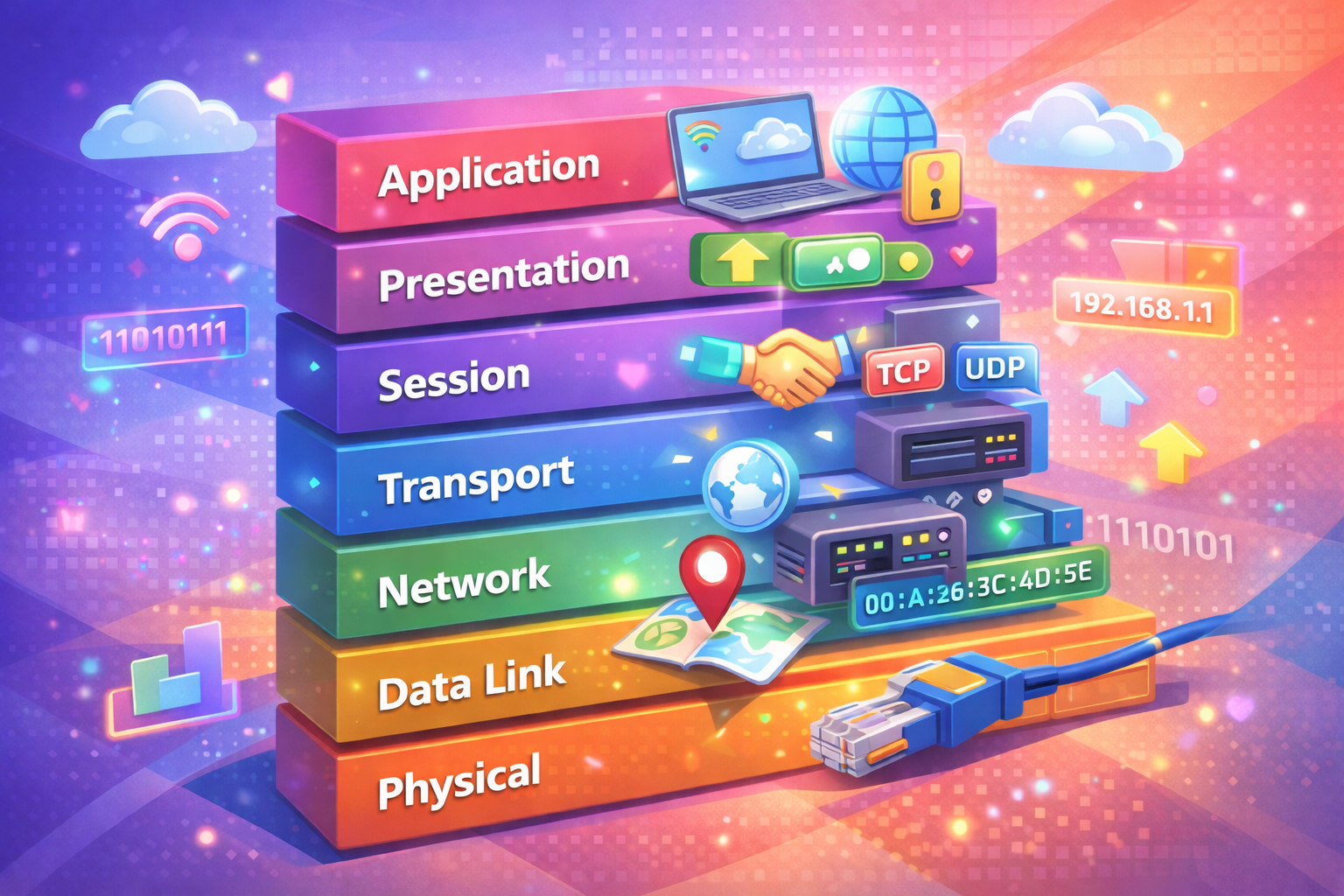 Kuasai model OSI dari teori hingga implementasi. Pelajari setiap lapisan, IP addressing, subnetting, DNS, TCP/UDP, dan ports—pengetahuan esensial untuk network engineers, software developers, cloud engineers, dan DevOps professionals.