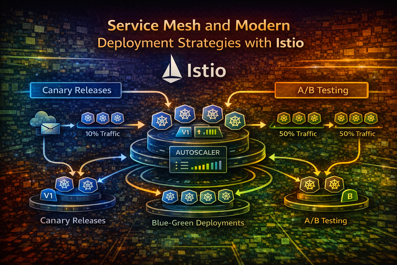 Service mesh seperti Istio mentransformasi cara Anda deploy kode. Alih-alih binary all-or-nothing deployments, Anda mendapatkan presisi tinggi: canary releases yang menangkap masalah lebih awal, blue-green deployments untuk instant switching, shadow traffic untuk testing tanpa risiko, dan A/B testing untuk validasi fitur.