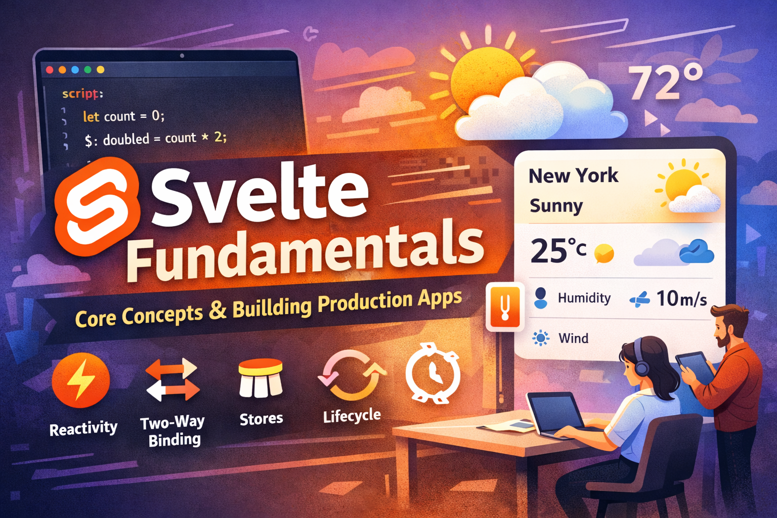 Kuasai Svelte dari dasar. Pelajari mengapa Svelte diciptakan, pahami core concepts seperti reactive declarations, two-way binding, stores, components, dan lifecycle hooks. Bangun complete production-ready weather dashboard app yang cover semua Svelte fundamentals dengan best practices.